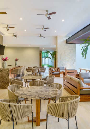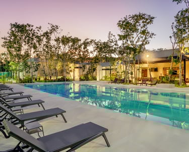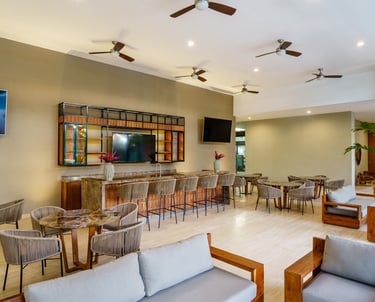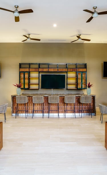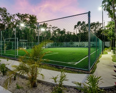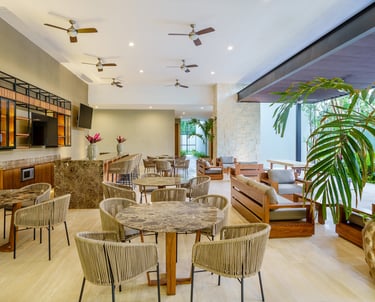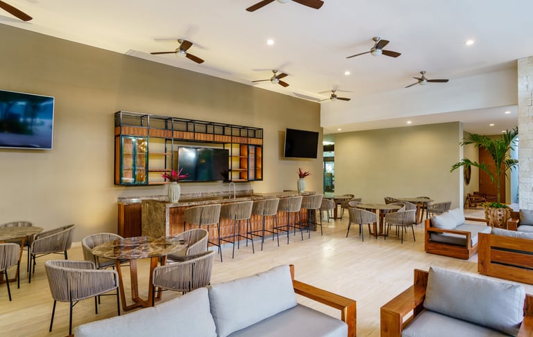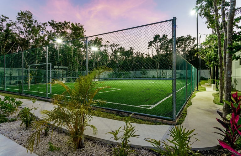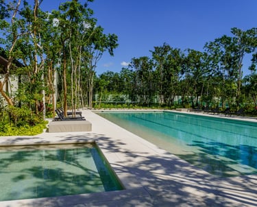 Además, vivirás rodeado de áreas verdes, alberca, palapa y seguridad 24/7, con acceso al Beach Club del Hotel Reef Playacar y a pasos del campo de golf